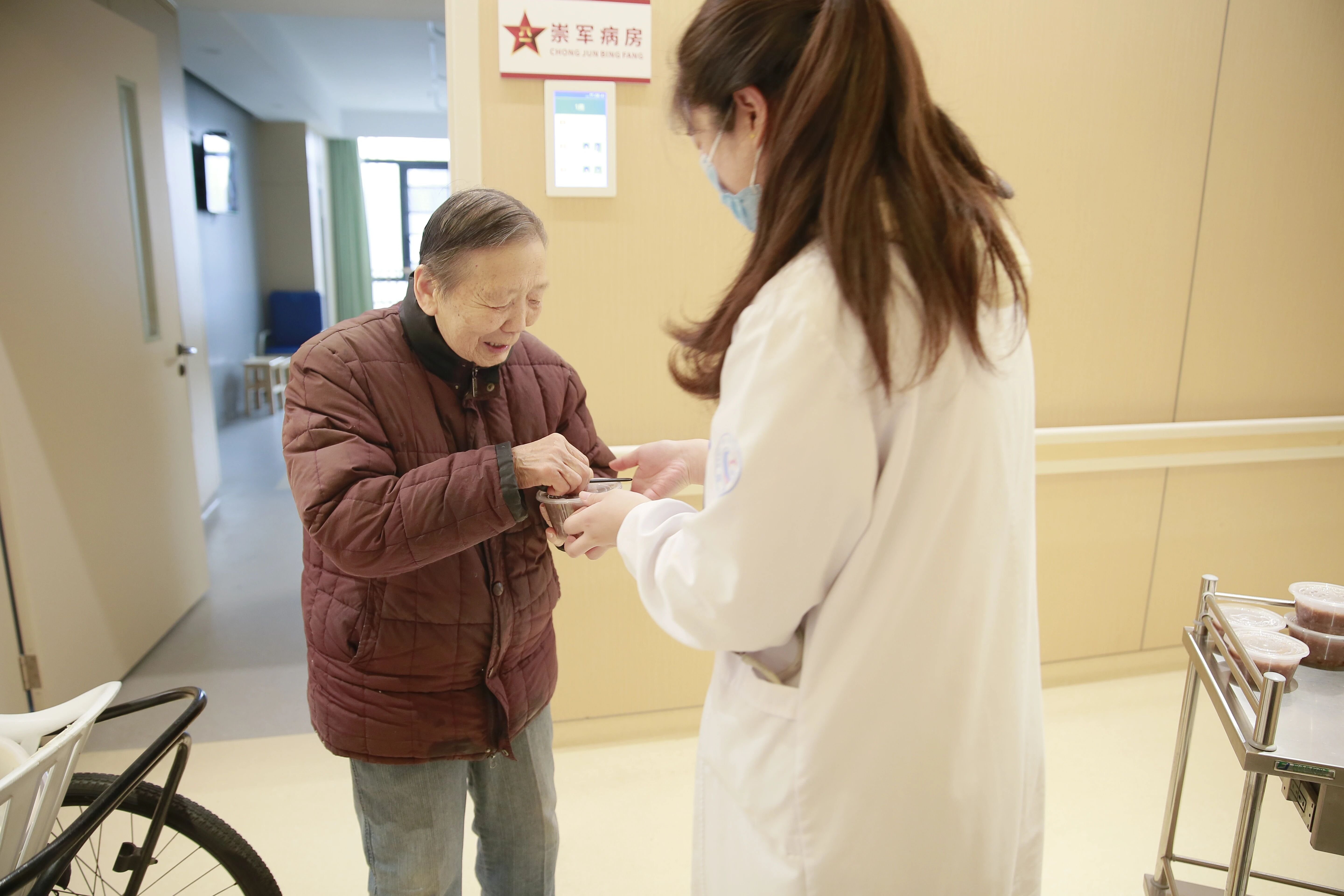 一大早,康复科的护士们就忙碌起来。熬煮好的腊八粥香气四溢,软糯的糯米、香甜的红枣、饱满的花生等食材融合在一起,色泽诱人。护士长李赛男带领护士们,一碗碗将温热的腊八粥送到患者手中,同时不忘叮嘱大家:“天冷,粥要趁热喝,小心烫口。”