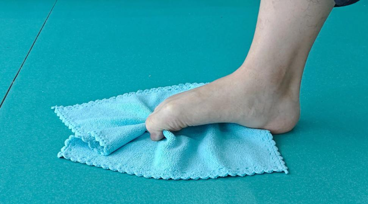 脚趾抓毛巾:坐姿,脚下放毛巾,用脚趾反复抓取、松开 。